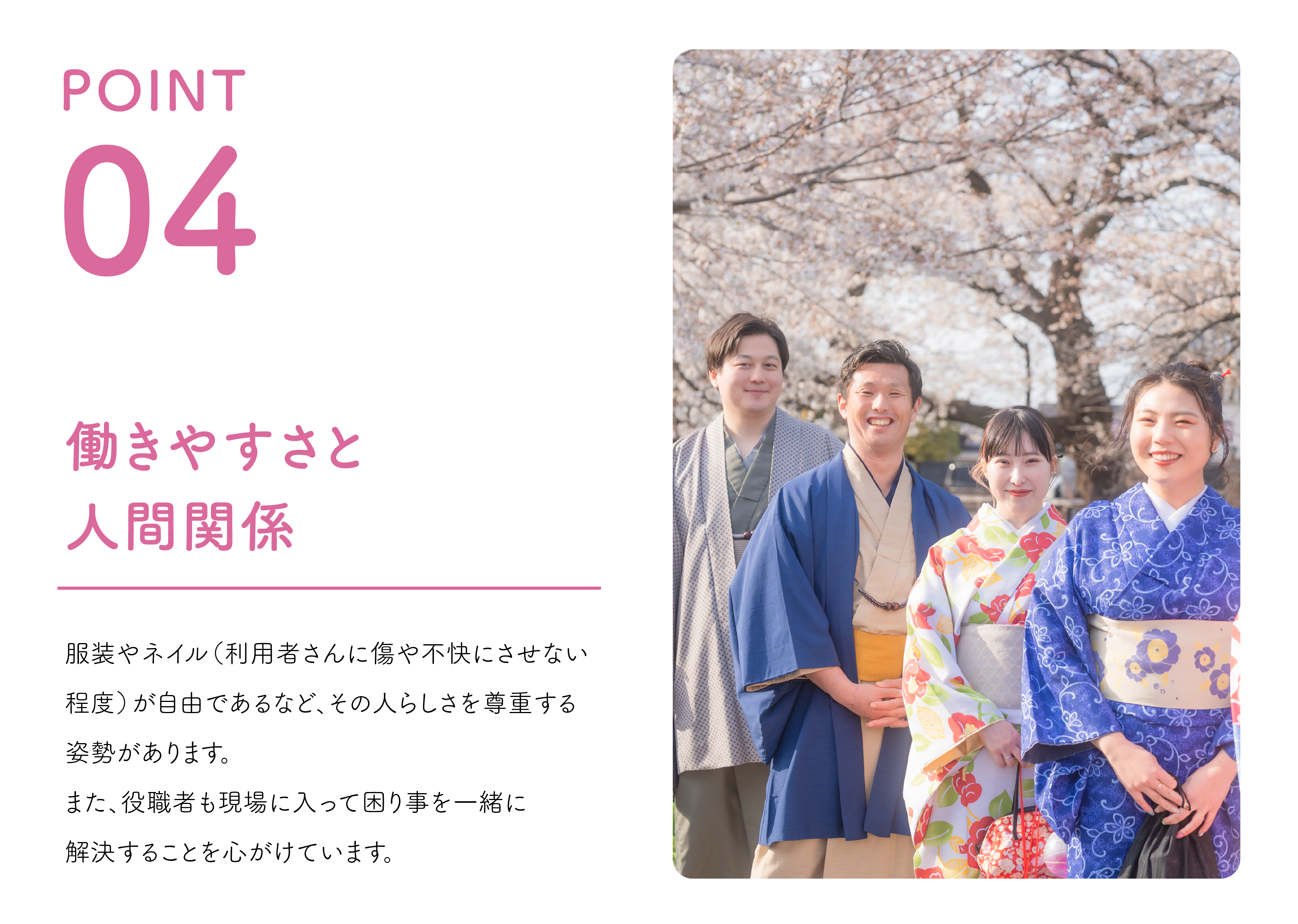 利用者さん1人1人が私たちを通じて笑顔になってくださるのが最高の幸せです。これからもさくらを大きくできるように頑張ります。